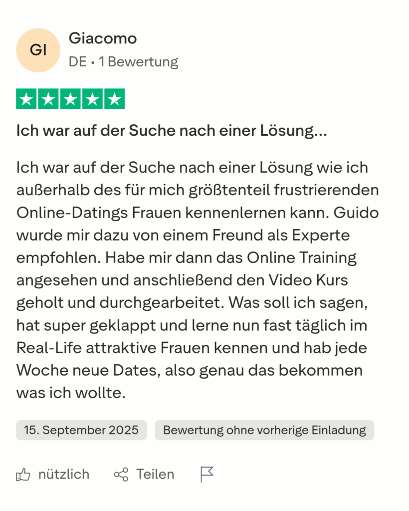 Ich zeige dir in 3 Schritten, wie Du als normaler Durschnittstyp im realen Leben „ohne“ Tinder, Online Dating & Social Media, jederzeit und überall die schönsten Frauen ansprichst, kennenlernst, datest, verführst & optional an dich bindest – zu 100% ehrlich und authentisch ohne faule Tricks.